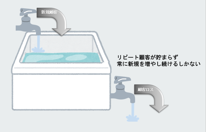 バケツに「リピート率の低さ」という大きな穴が空いたまま、リピート率が低いまま新規を集めても、